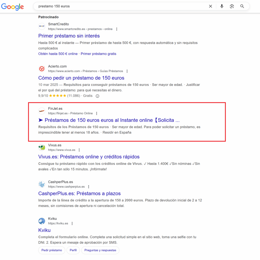 El sector de los préstamos rápidos está saturado en España, con grandes competidores bien posicionados y un nivel de desconfianza elevado por parte del público. El reto era claro: lograr que una nueva marca, Finjet, destacara en las búsquedas orgánicas frente a gigantes del sector y, al mismo tiempo, transmitir credibilidad a usuarios que necesitaban financiación urgente.